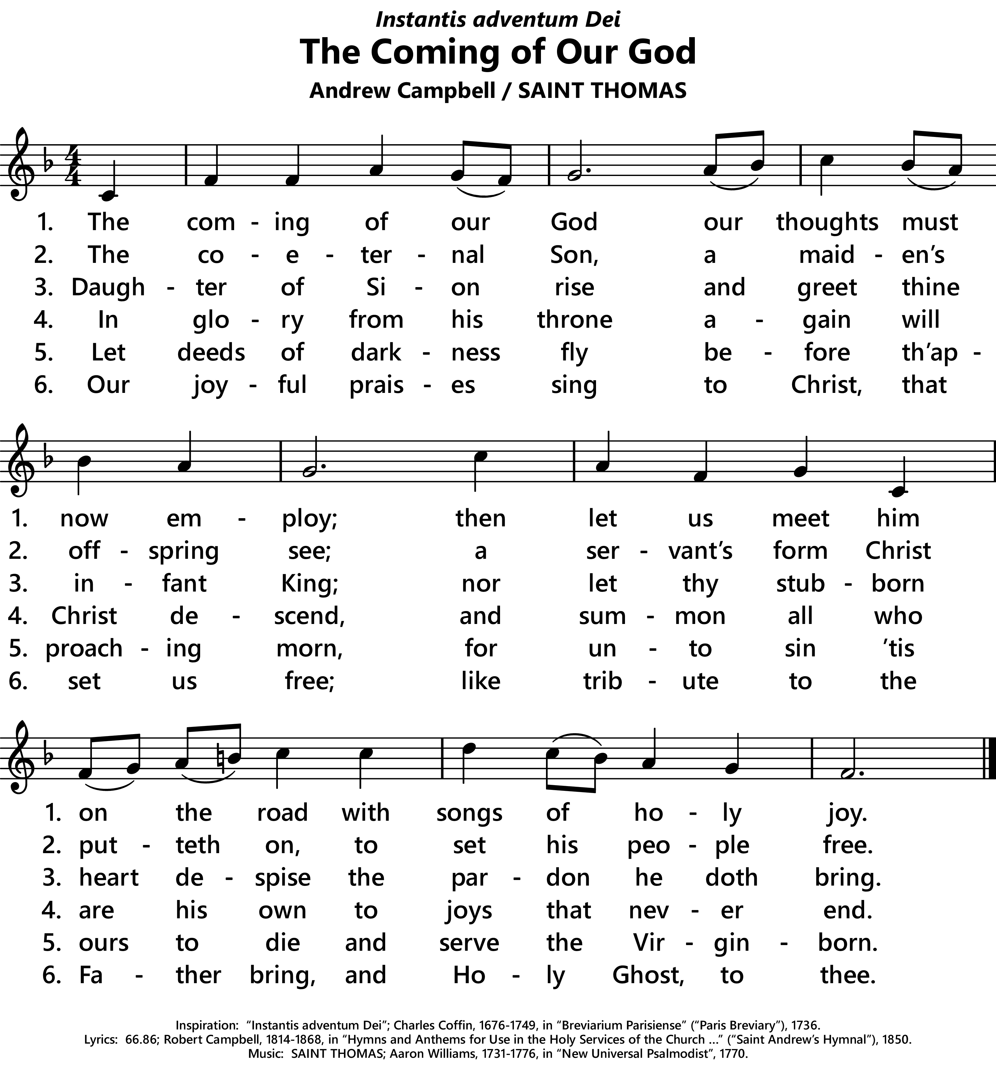 | Hymnals: | Heritage Missal 2026-29: 161 (The Advent of Our King) Journeysongs, 2nd ed.: 322 (The Advent of Our King) Journeysongs, 3rd ed.: 287 (The Advent of Our King) |