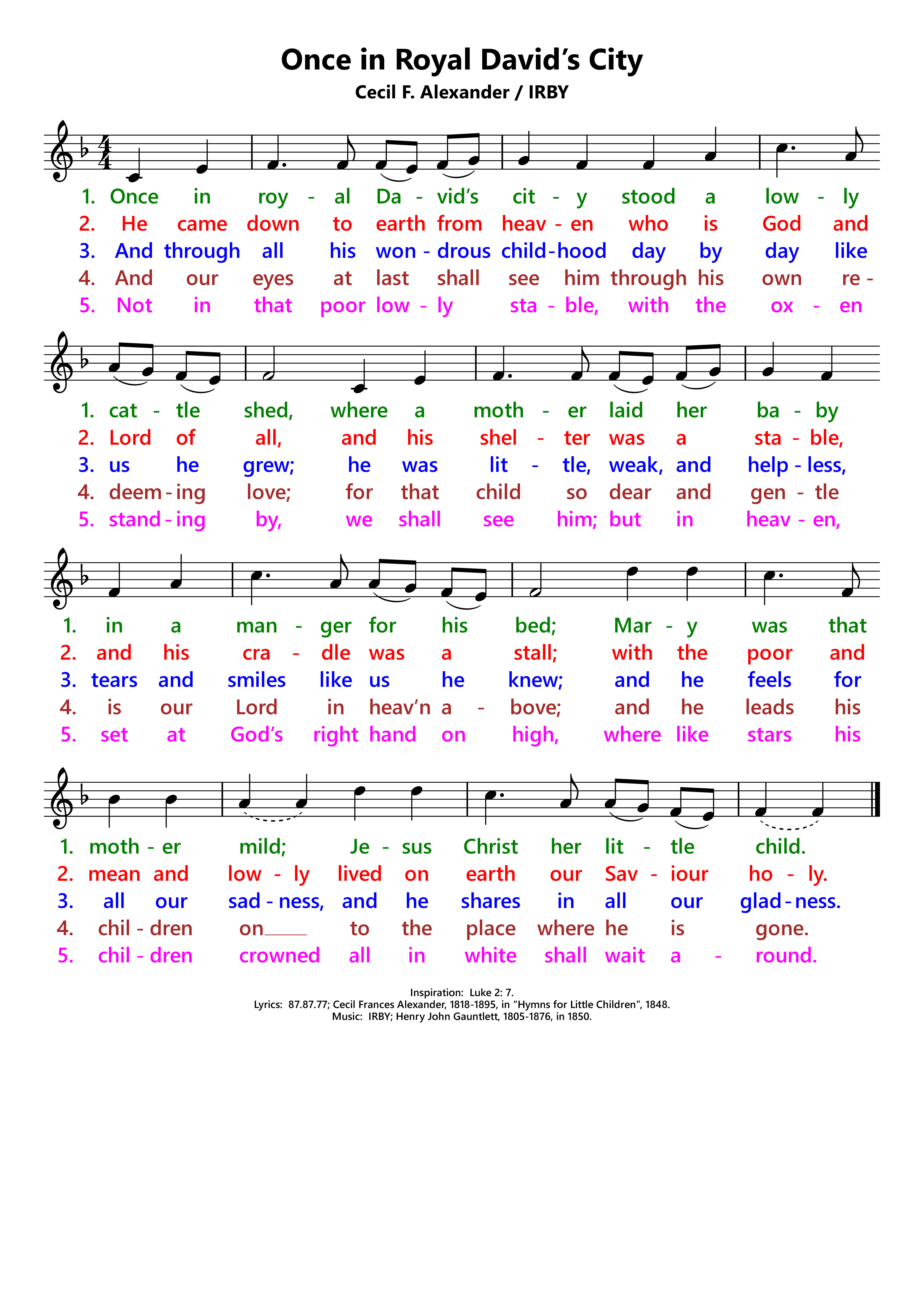 | Lyrics: | Cecil Frances Alexander, 1818-1895, in Hymns for Little Children, 1848. |