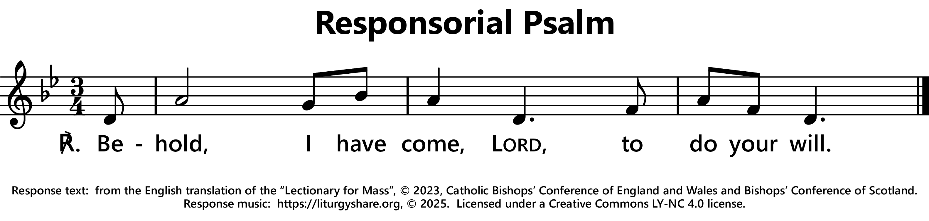 | ℟: | Psalm 40 (39): 8a+9a Ecce venio, Domine, facere voluntatem tuam. Here I am, Lord; I come to do your will. (Oz, US) Behold, I have come, Lord, to do your will. (UK) |