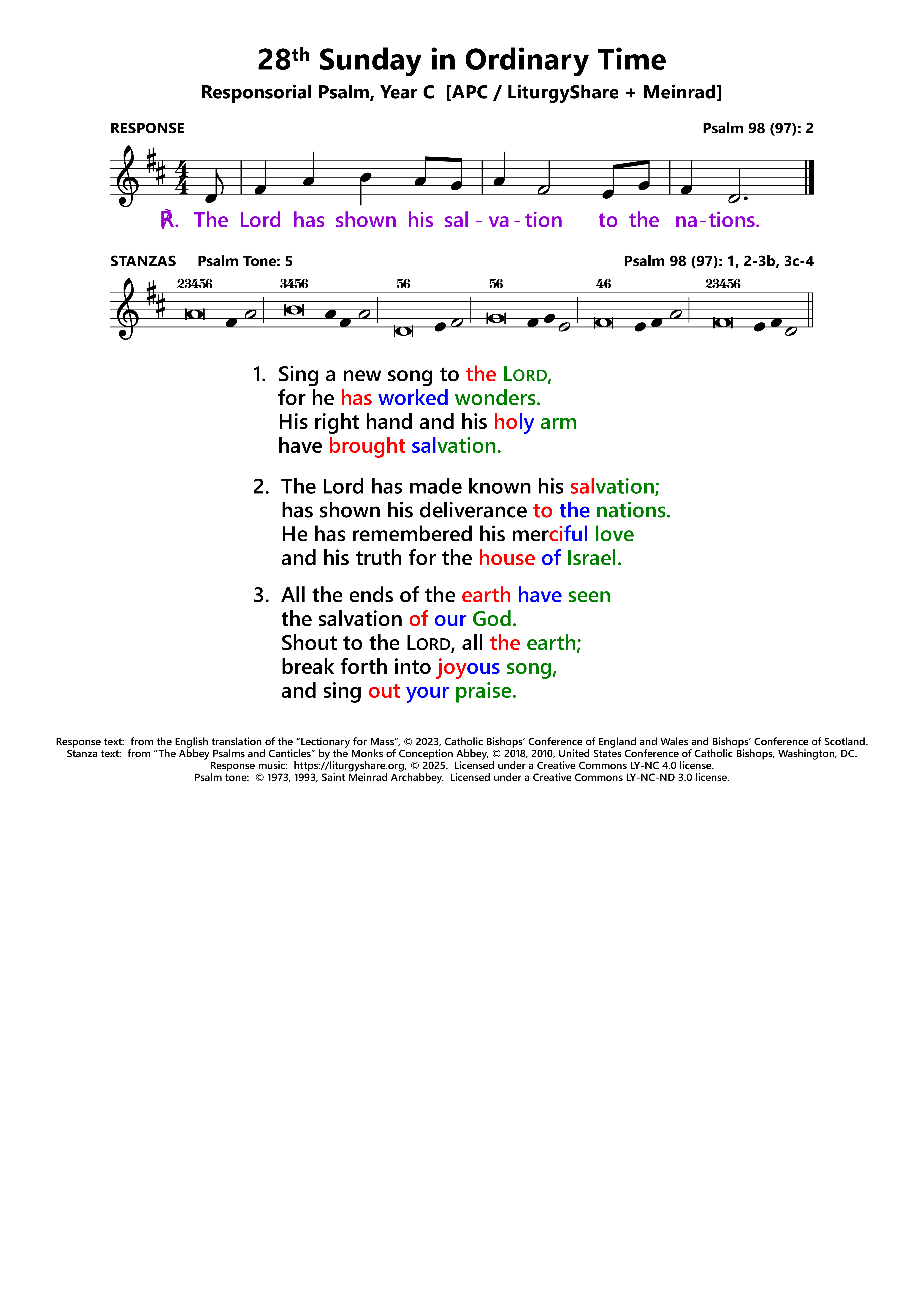 ℣: | Psalm 98 (97): 1, 2-3b, 3c-4. Psalm 98 (97): 1, 2-3b, 3cd+4ac. (Oz) |