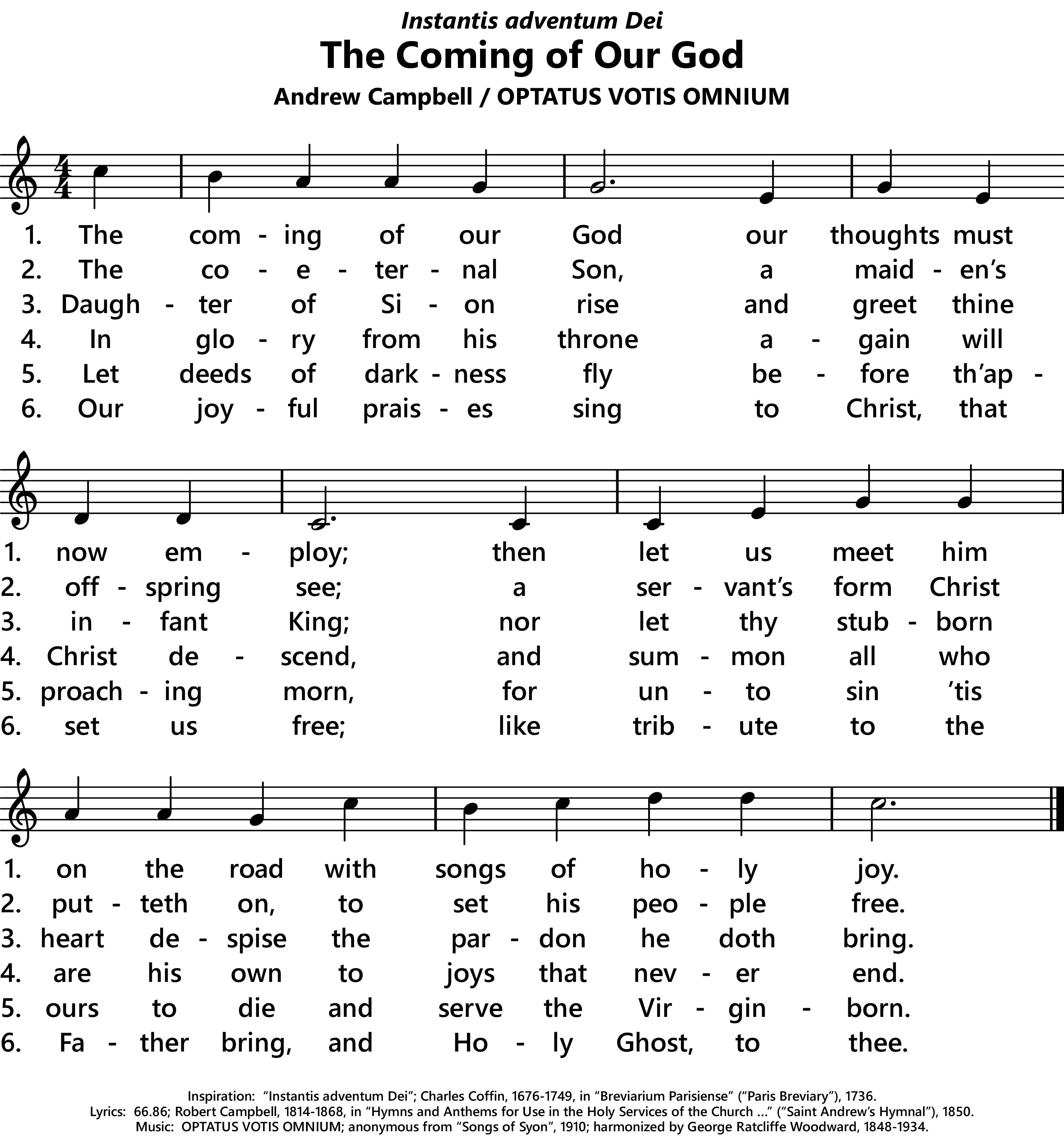| Titles: | OCP changes the first line (and title) to The Advent of Our King when used with FRANCONIA (but not OPTATUS VOTIS OMNIUM) and only used the second coming verses in its missals. Divine Office 1974 only uses the incarnation verses, excluding the first verse, so it is retitled The Co-eternal Son |