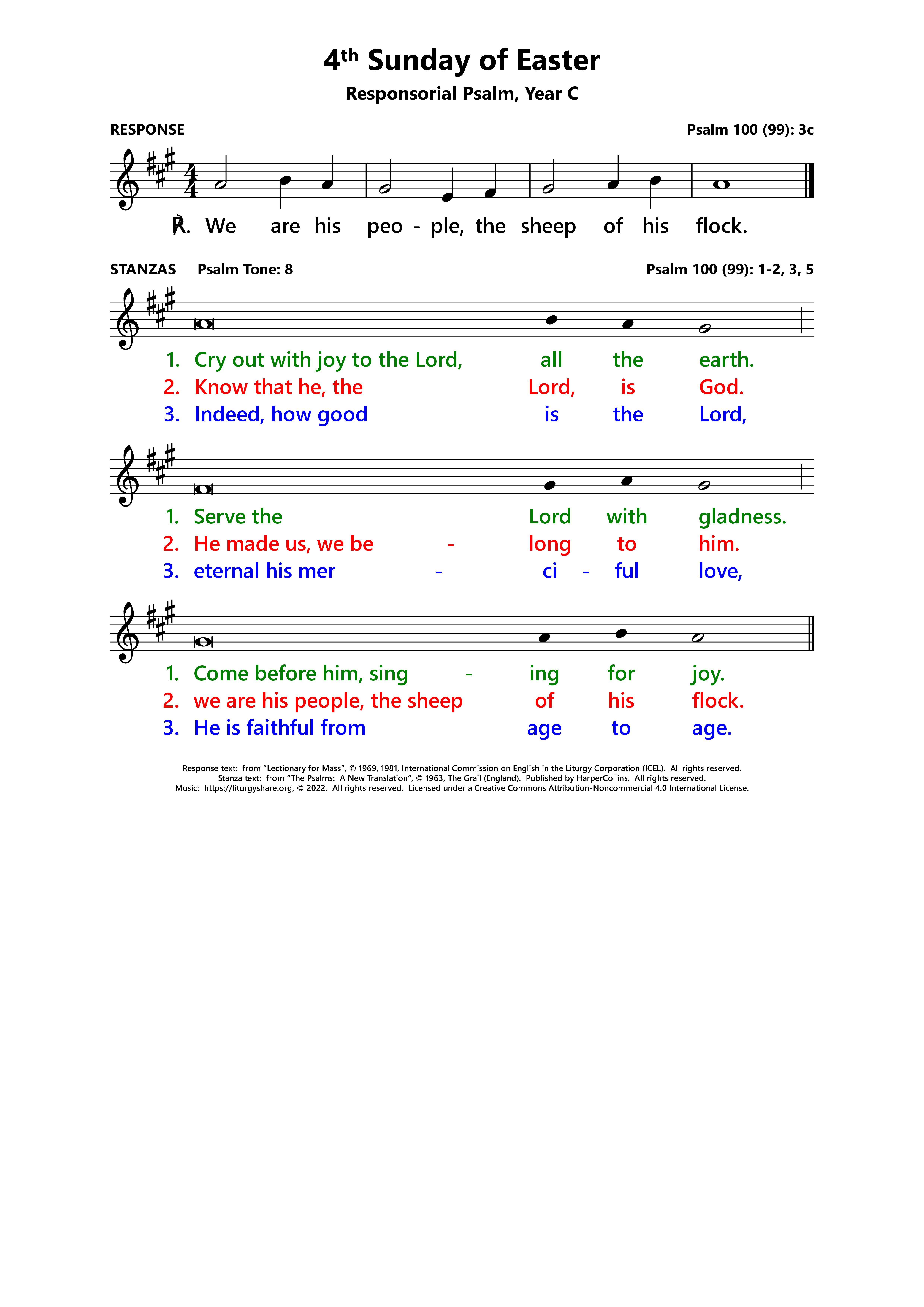 | ℟: | Psalm 100 (99): 3c Nos populus eius et oves pascuae eius. We are his people, the sheep of his flock. |