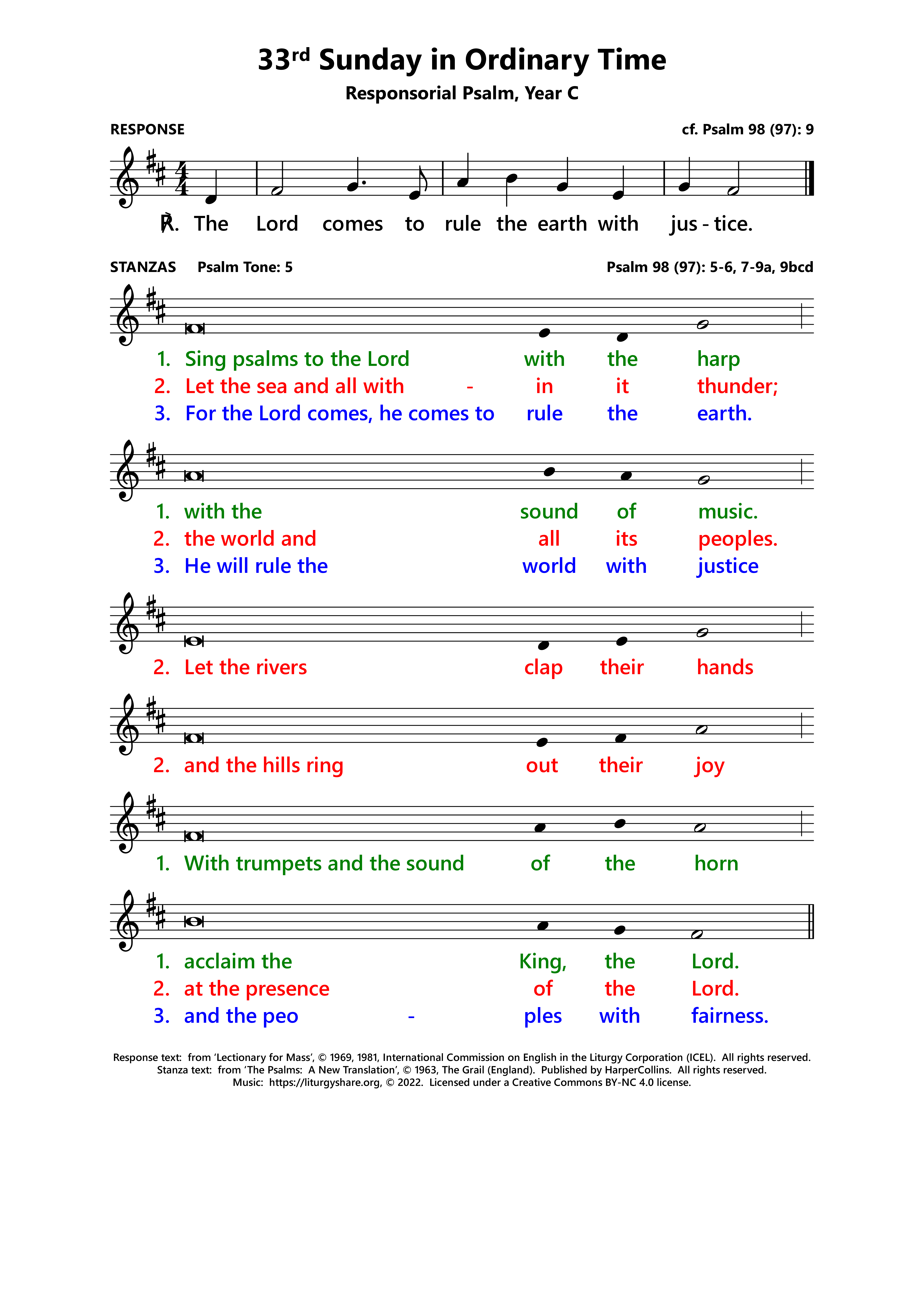 | ℟: | cf. Psalm 98 (97): 9 Venit Dominus iudicare populos in aequitate. The Lord comes to rule the earth with justice. (Oz, US) The Lord comes to judge the peoples with fairness. (UK) |