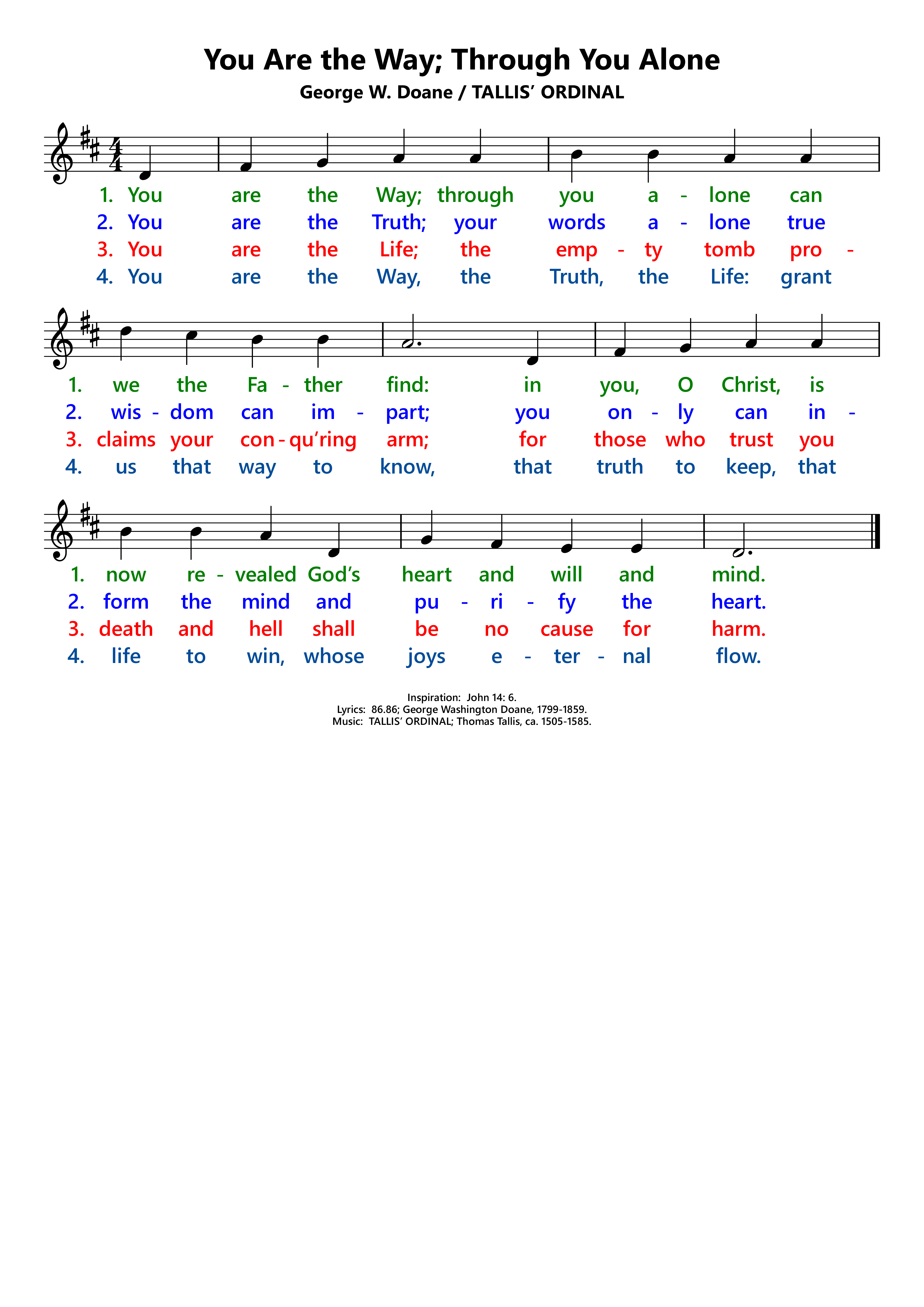 | traditional lyrics (Thou Art the Way; to Thee Alone): lyrics • harmony • score • keyboard • lead • tablet • choir • assembly • slides | |