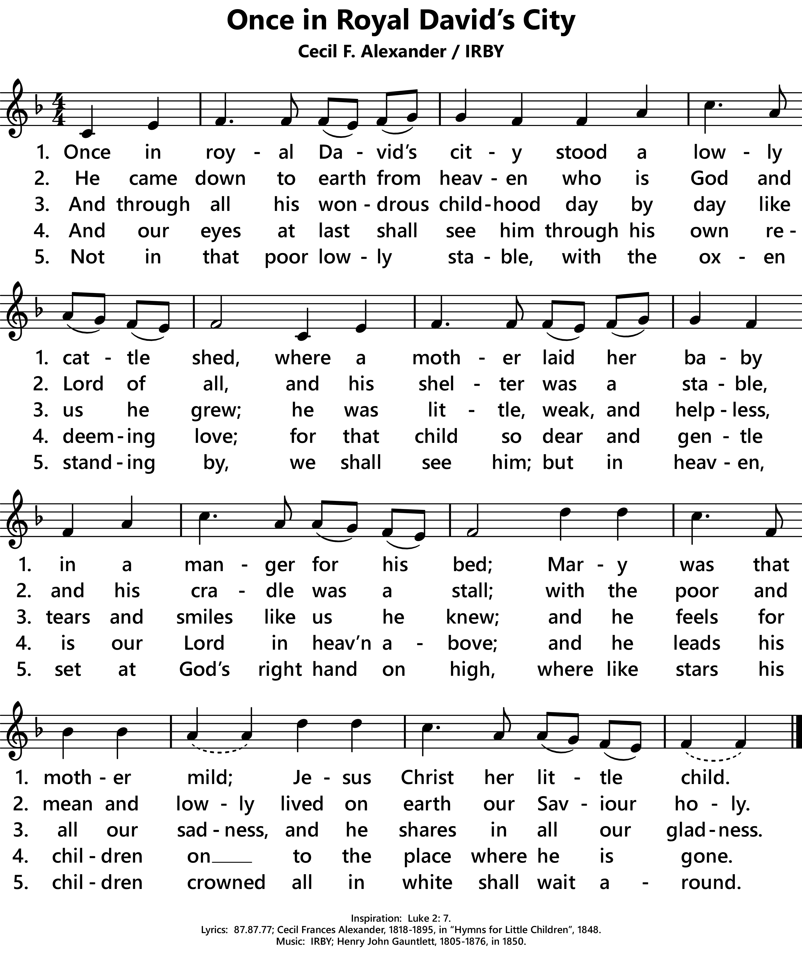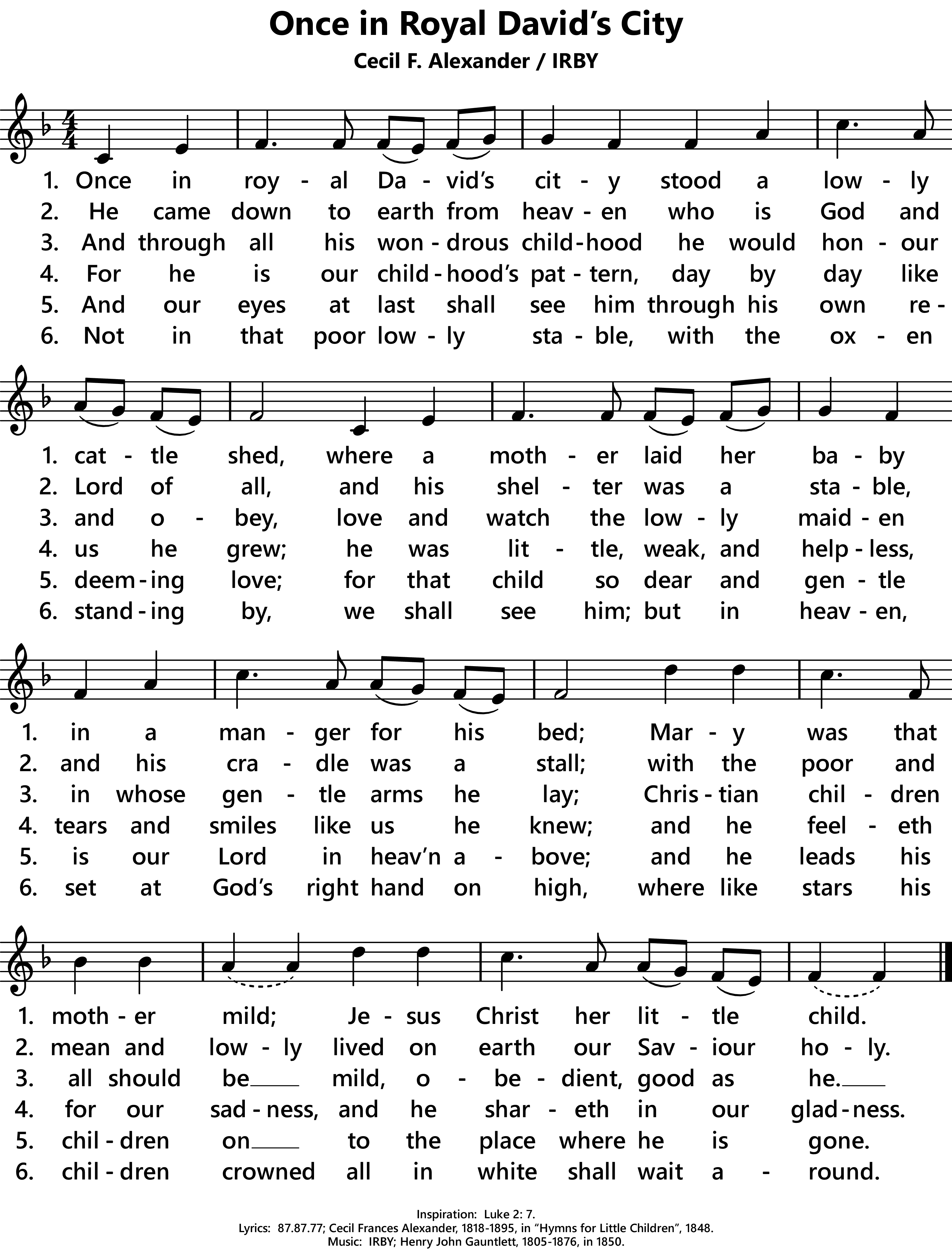 | Lyrics: | Cecil Frances Alexander, 1818-1895, in Hymns for Little Children, 1848. |