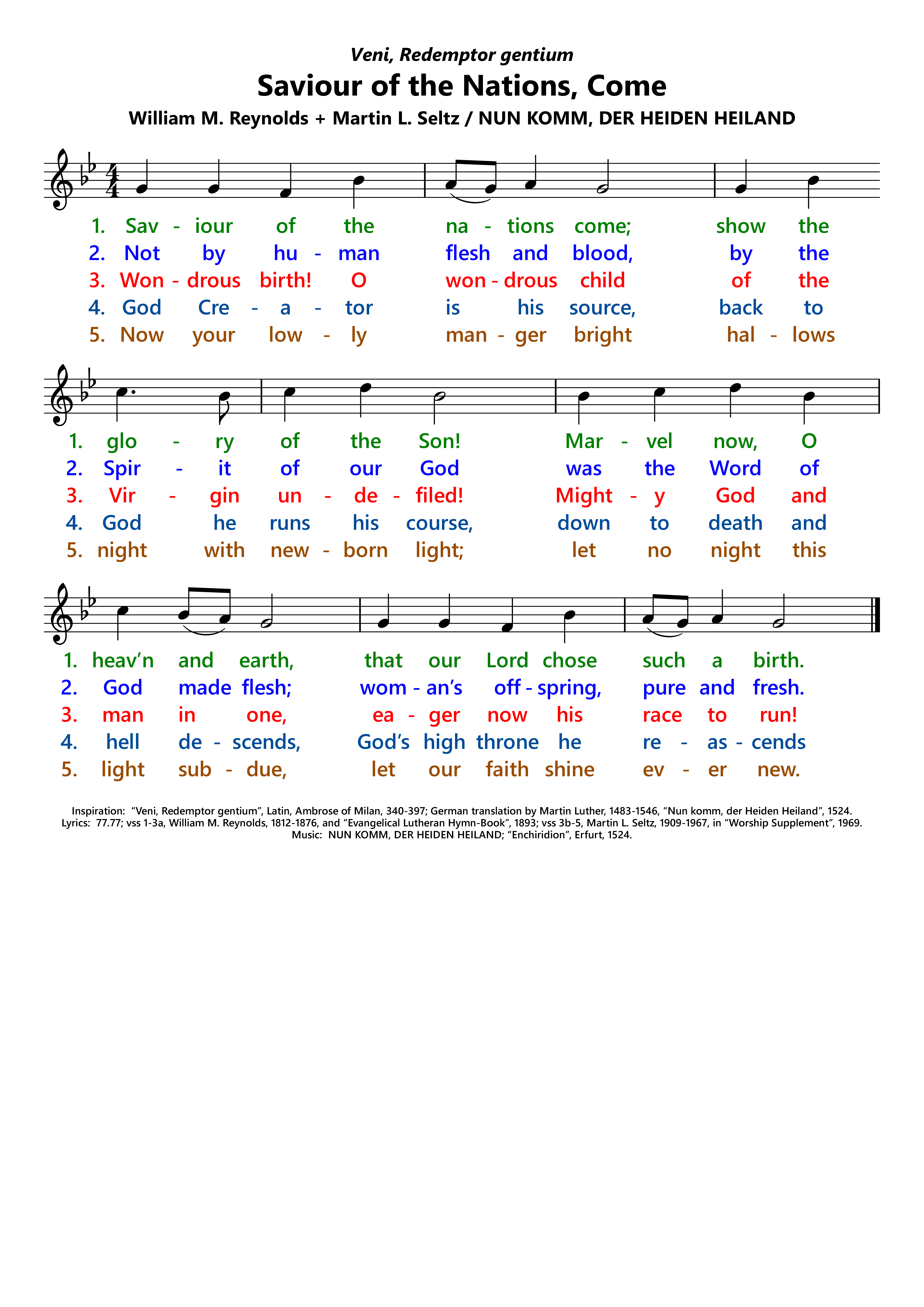 | Inspiration: | German translation, Martin Luther, 1483-1546, Nun komm, der Heiden Heiland, 1524. |