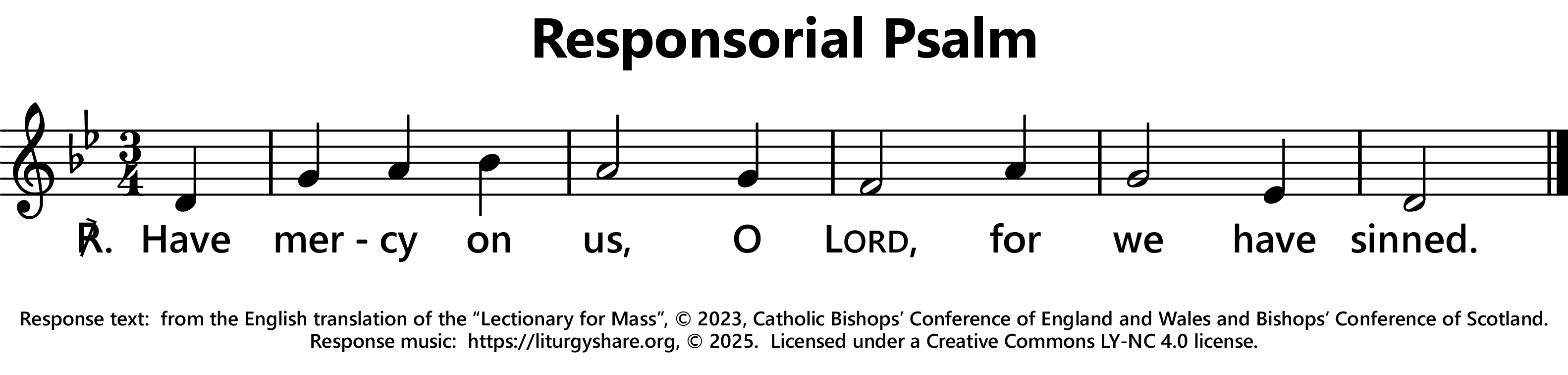 | ℟: | cf. Psalm 51 (50): 3a Miserere, Domine, quia peccavimus.. Be merciful, O Lord, for we have sinned. (Oz, US) Have mercy on us, O Lord, for we have sinned. (UK) |
