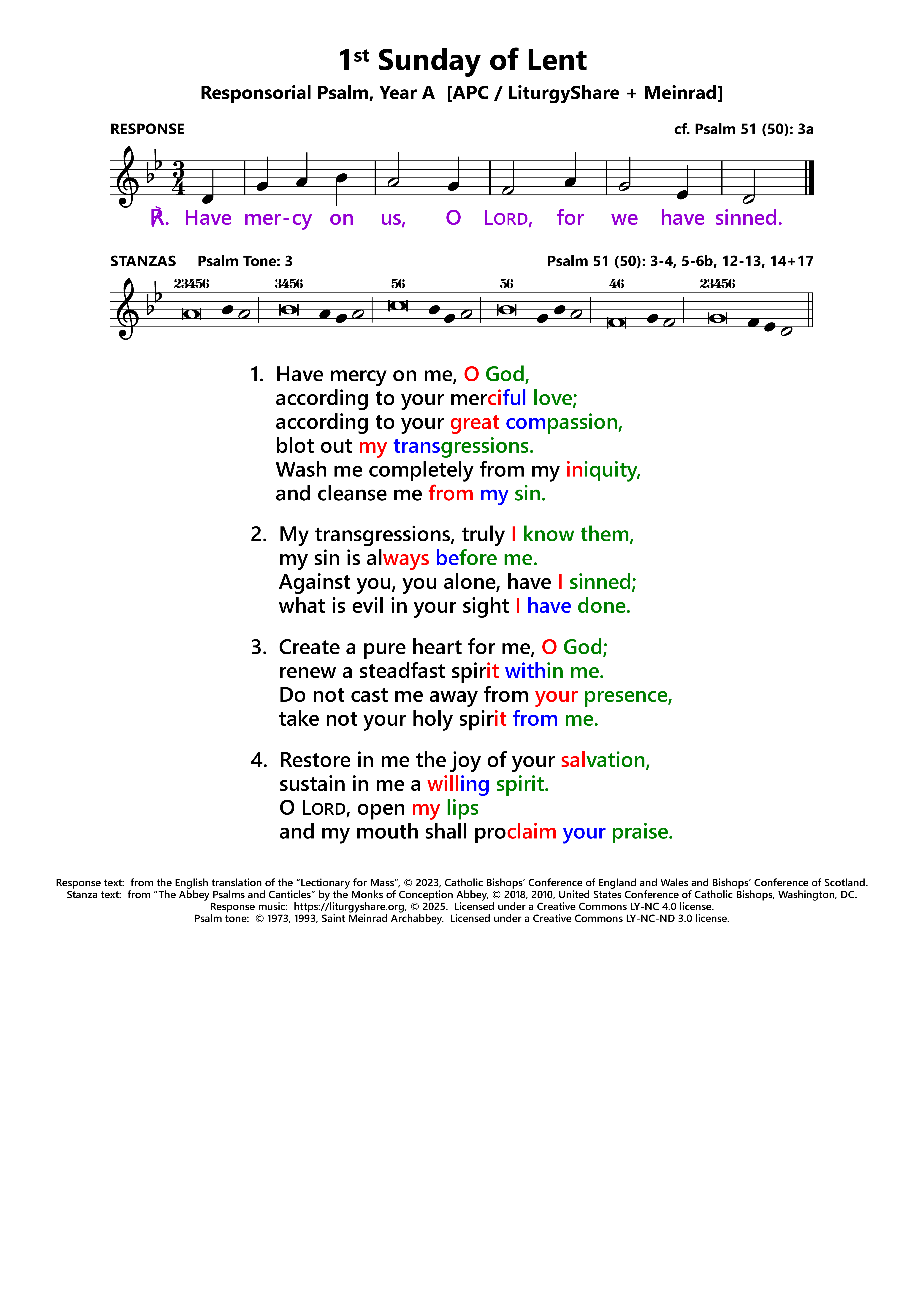 | Use: | Ash Wednesday (219) 1st Sunday of Lent, Year A (22) Common Psalm A for Lent (174/5) |