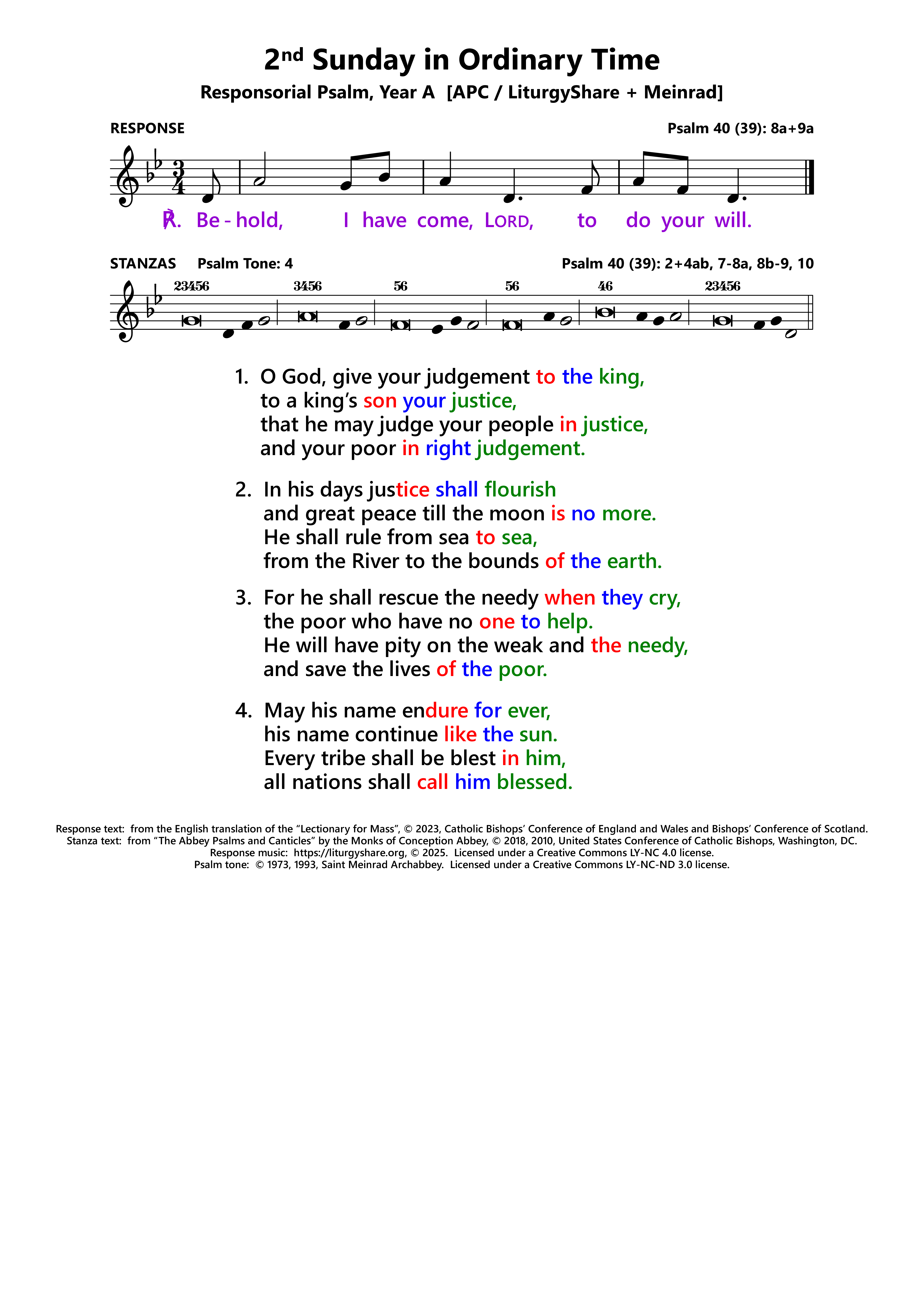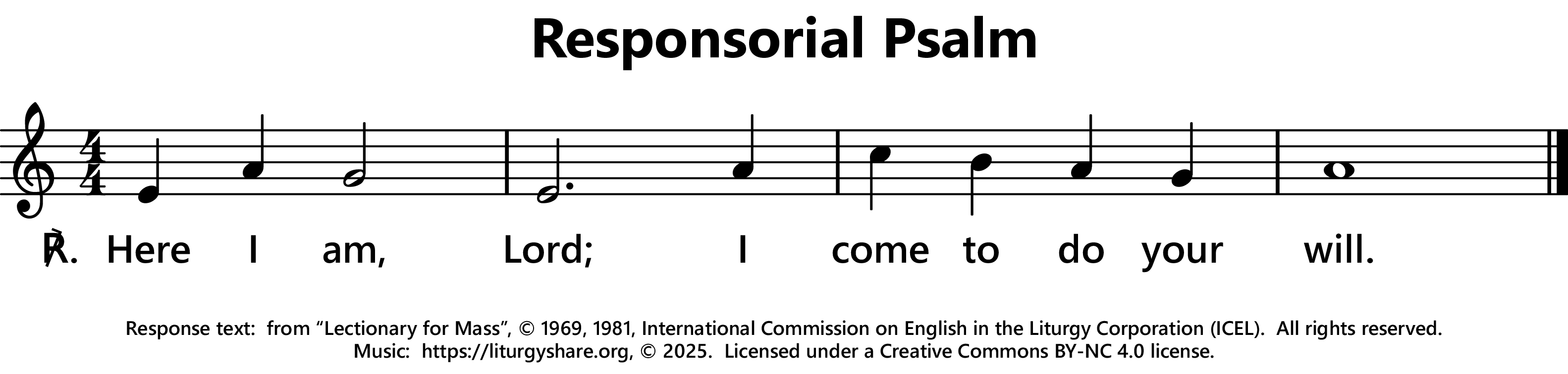 | ℟: | Psalm 40 (39): 8a+9a Ecce venio, Domine, facere voluntatem tuam. Here I am, Lord; I come to do your will. (Oz, US) Behold, I have come, Lord, to do your will. (UK) |
