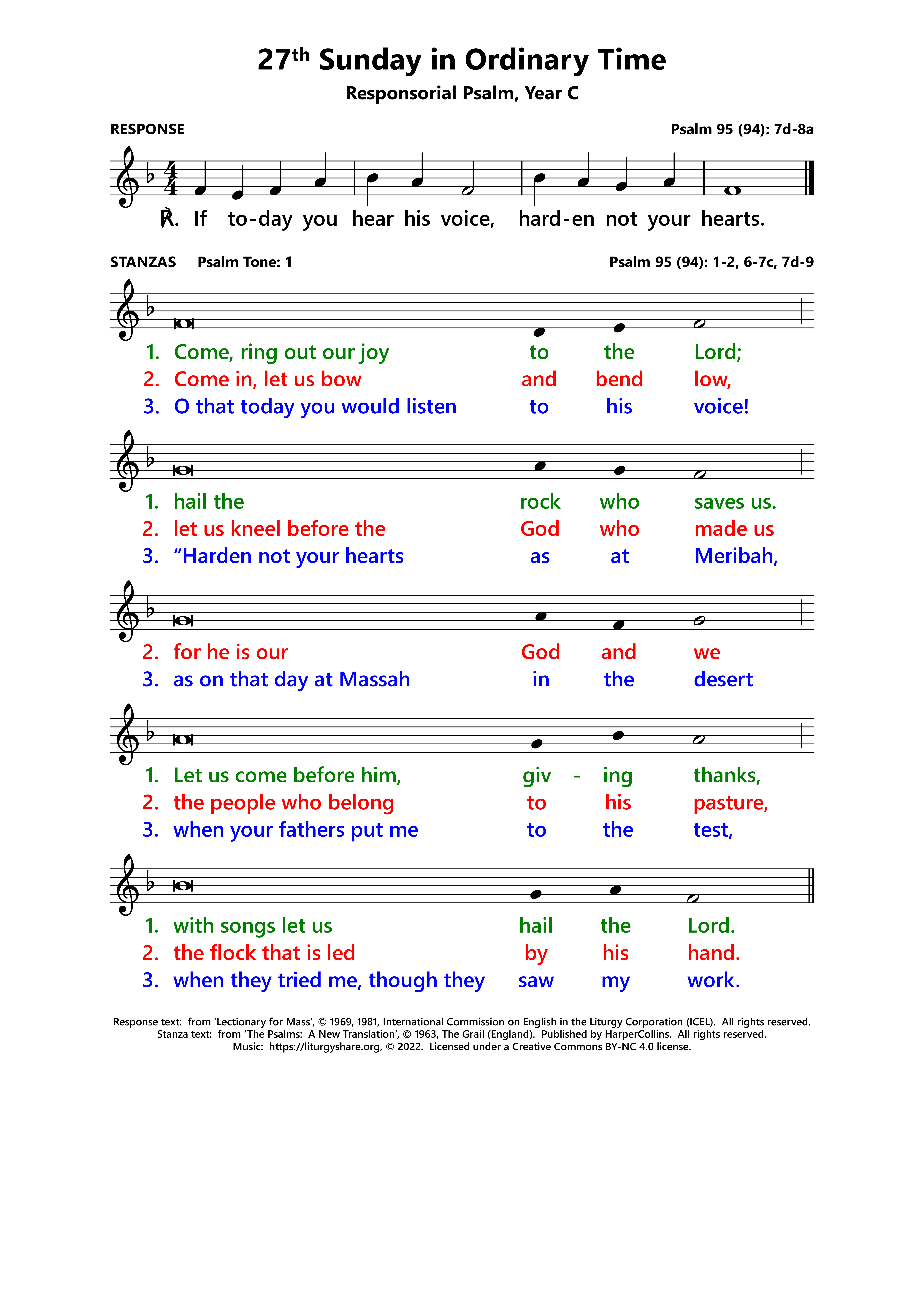 | ℟: | cf. Psalm 95 (94): 7c-8a. Utinam hodie vocem Domini audiatis: ‘Nolite obdurare corda vestra’. If today you hear his voice, harden not your hearts. (Oz, US) O that today you would listen to his voice! ‘Harden not your hearts.’ |