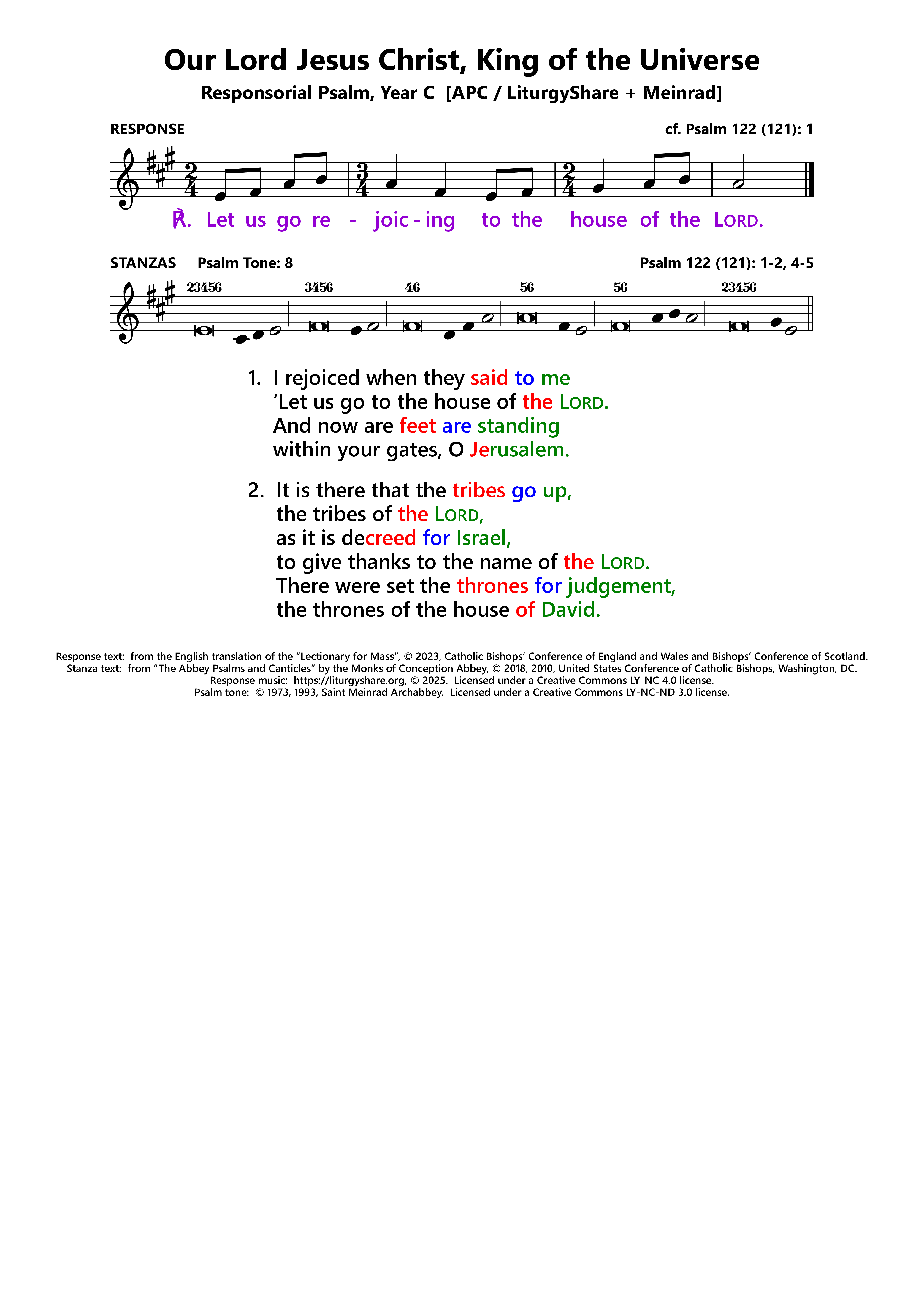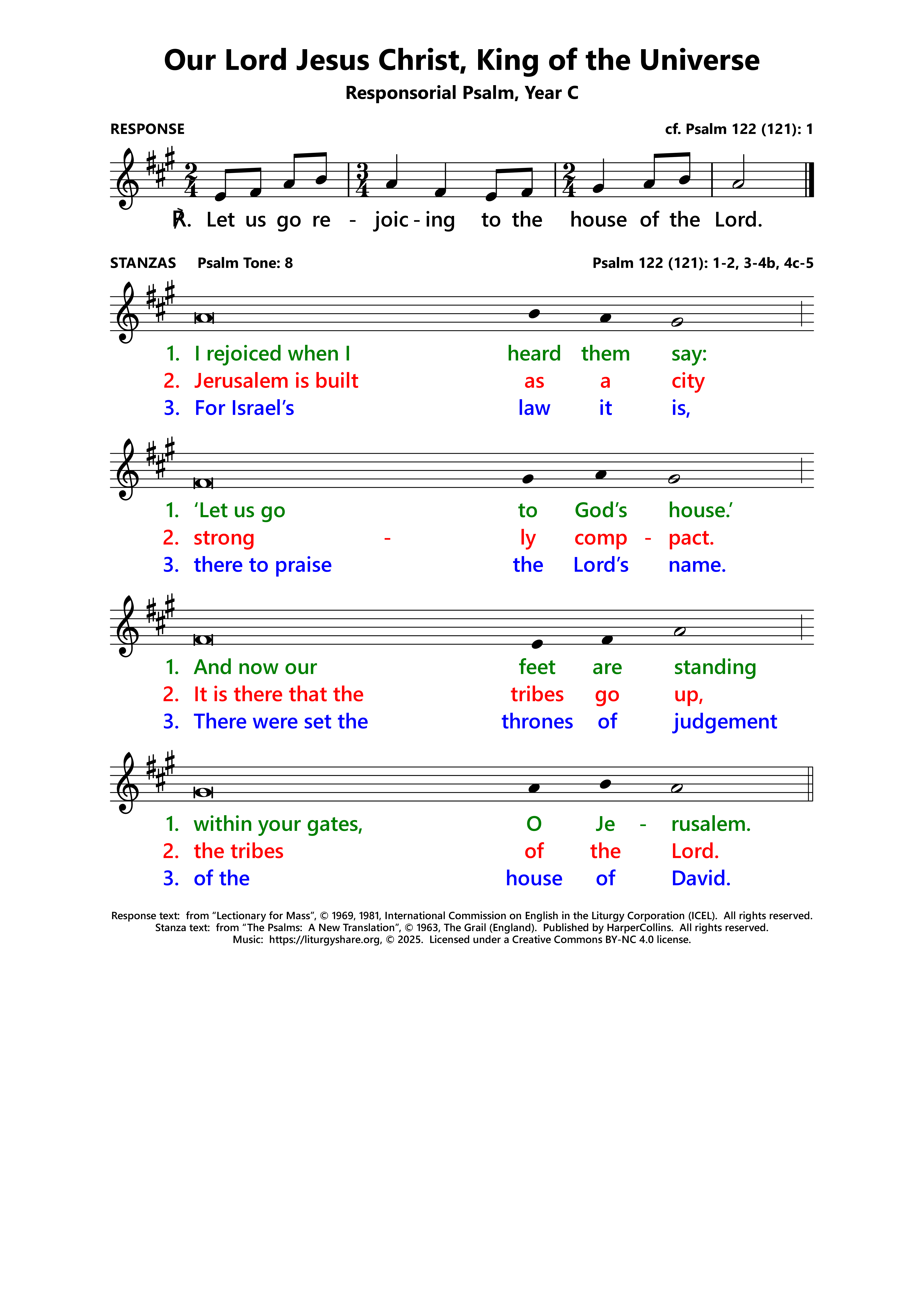 | ℣: | Psalm 122 (121): 1-2, 4-5 Psalm 122 (121): 1-2, 3-4b, 4c-5 (Oz, US) |